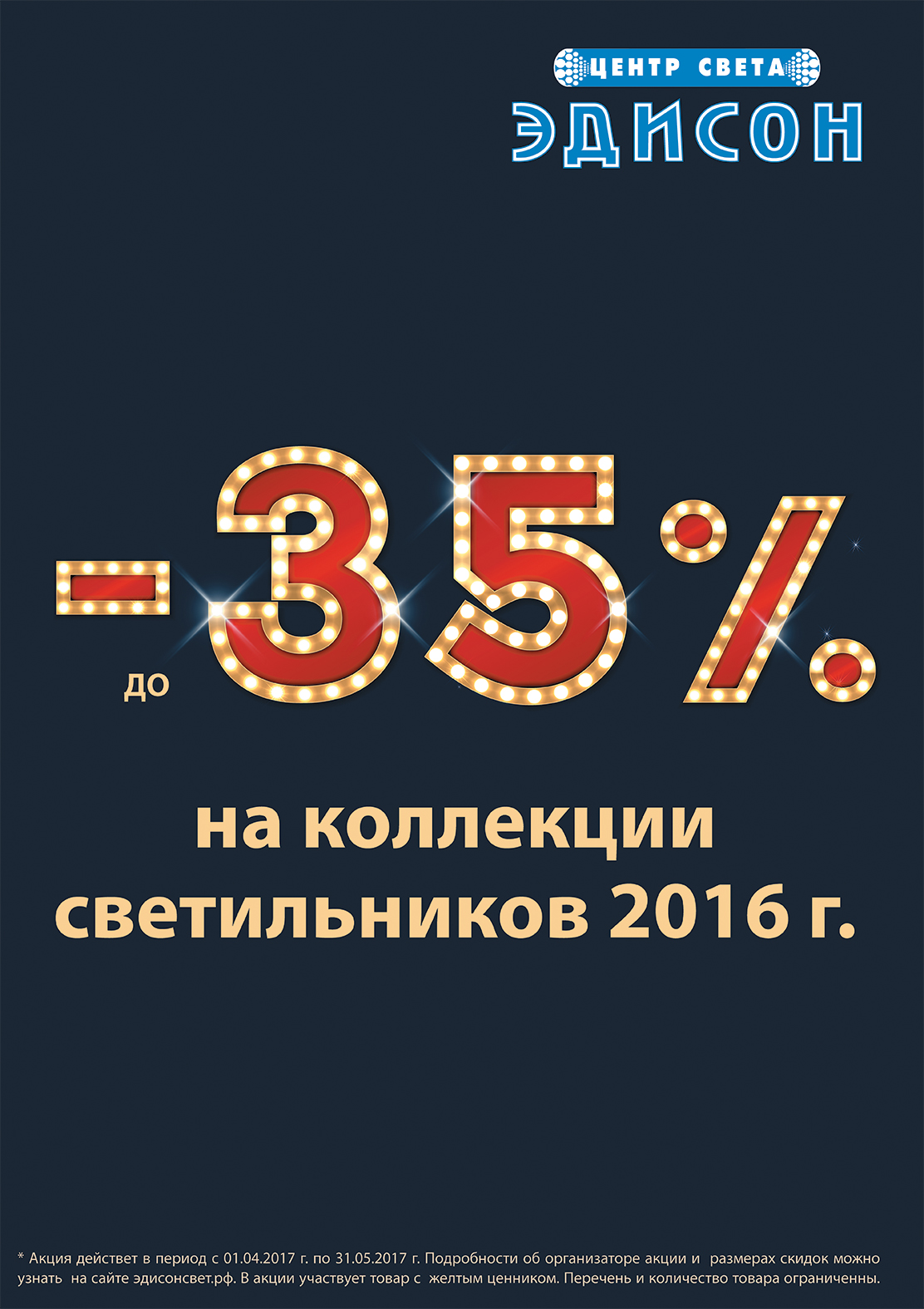 До конца мая 2017 г. в оффлайн магазинах Центр света «Эдисон» продолжается распродажа! На коллекции прошлых лет действует скидка до 35%!