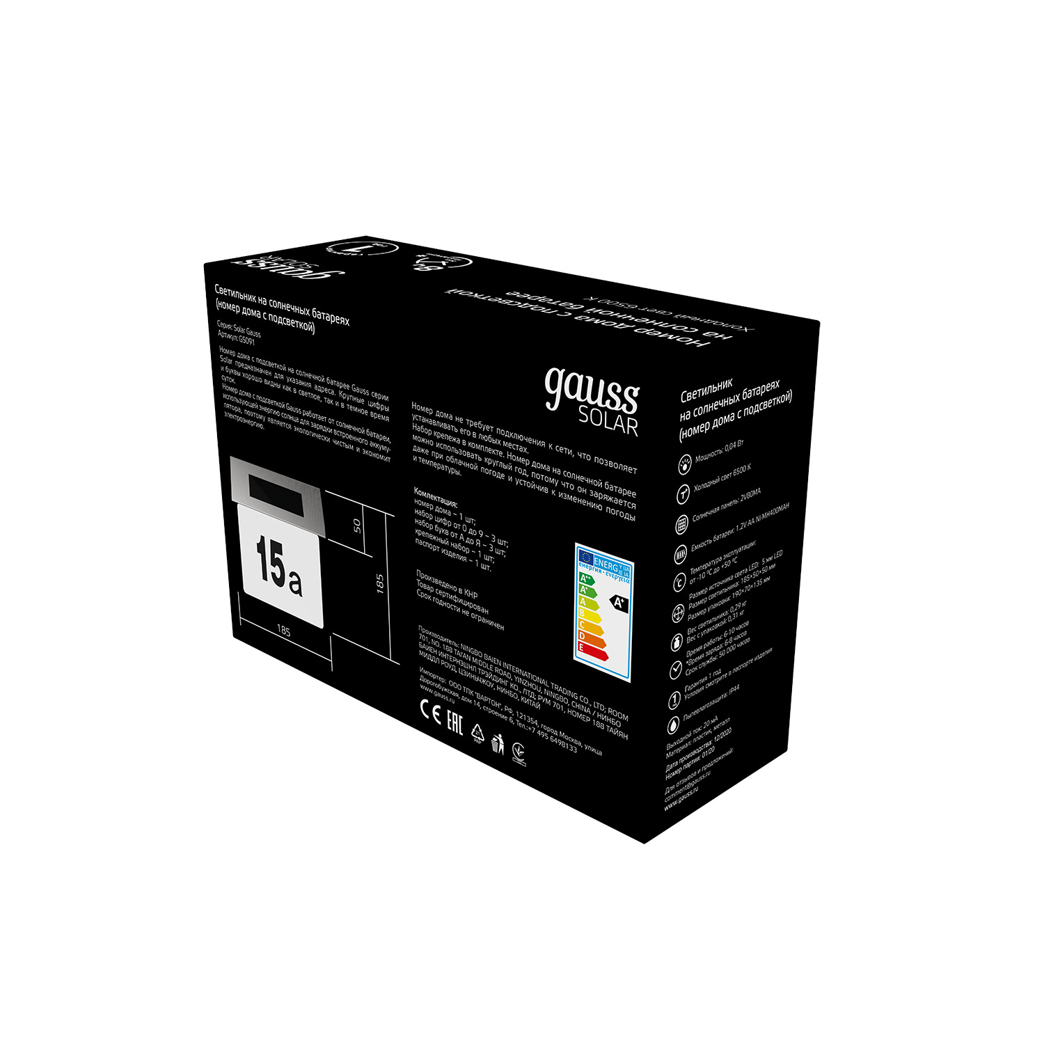 Светильник на солнечных батареях Gauss серии Solar предназначен для подсветки указания номера дома. Номер дома с подсветкой Gauss работает от солнечной батареи, использующей энергию солнца для зарядки встроенного аккумулятора, поэтому является экологически чистым и экономит электроэнергию. Номер дома с подсветкой не требует подключения к сети, что позволяет устанавливать его в любых, даже труднодоступных местах. Номер дома с подсветкой на солнечной батарее можно использовать круглый год, потому что он заряжается даже при облачной погоде и устойчив к изменению погоды и температуры.