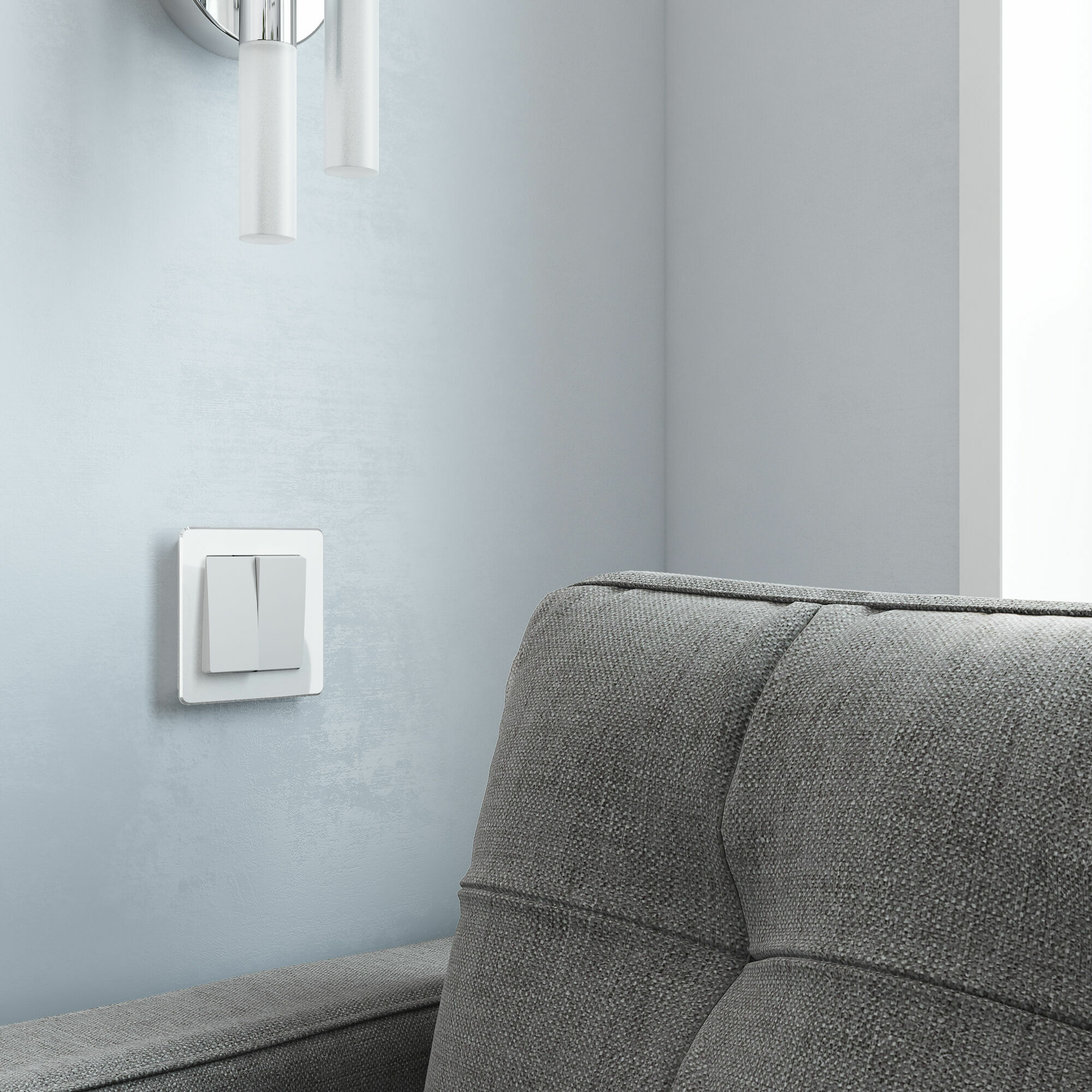 Механизм двухклавишного выключателя оснащен матовой лицевой панелью. Матовая поверхность – это современный тренд, задающий стиль вашему интерьеру. Она не бликует, обладает бархатистой фактурой и тактильной мягкостью. Белый цвет будет эффектно смотреться в любом интерьерном пространстве и гармонично сочетаться с любыми материалами.