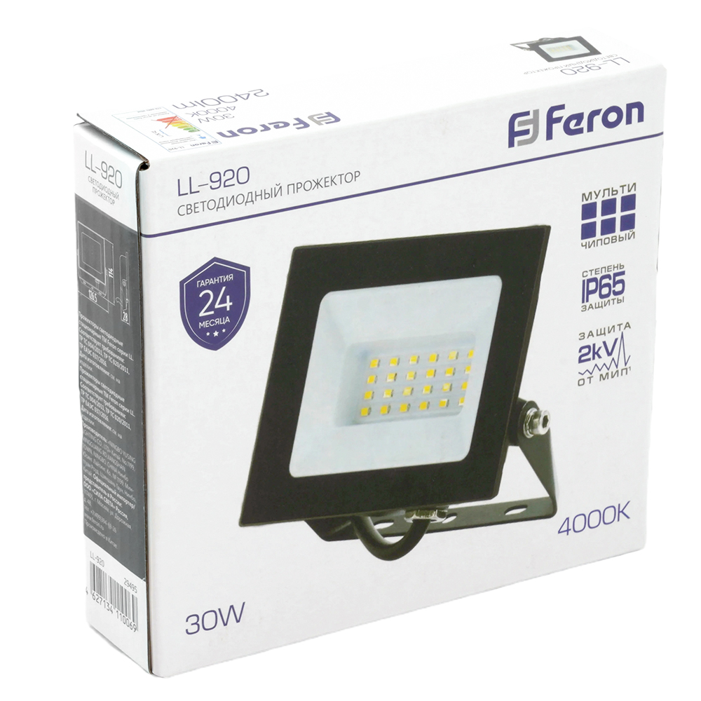 Прожектор светодиодный многоматричный с монтажным креплением на кронштейн, (ДО) FERON LL-920 , 30W, 4000К (белый), 230V/50Гц, 3000Lm, IP65, угол рассеивания 120°,*SMD2835, раб.t -40°C - +40°C, цвет чёрный, корпус алюминий литой под давлением + стекло, 126,5*114*28 мм