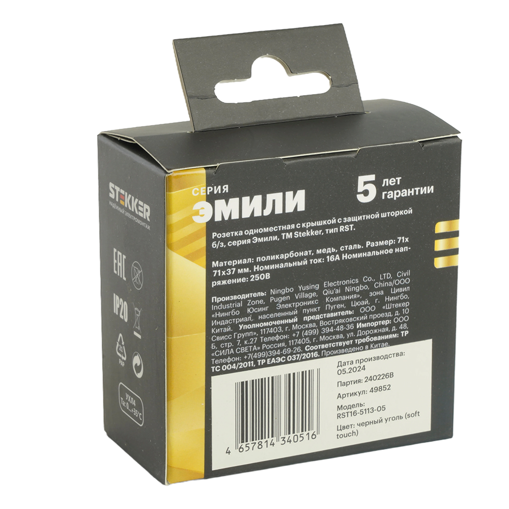 Розетка STEKKER RST16-5113-05 на 1 гнездо, да, без заземления. Материал: поликарбонат, бронза, сталь, цвет черный уголь, soft touch, размер 71*71*37мм. Номинальное напряжение 250, номинальный ток 16А, диапазон рабочих температур 0..+35°C, 42
