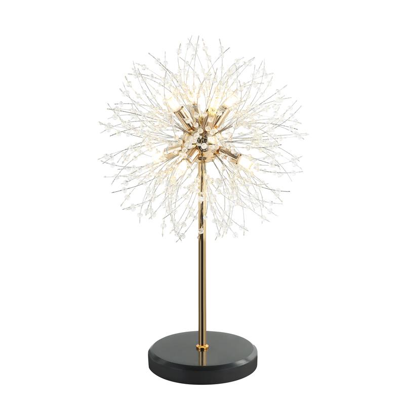 Светильник настольный из коллекции Salut / Салют выполнен из металла, гальванизированного в цвет золота, и декорирован хрустальными бусинами, имитирующими салют. В основе настольной лампы используется натуральный мрамор.
