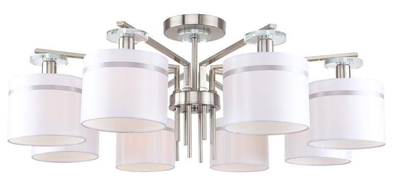 Люстра потолочная из коллекции Chart / Чарт выполнена из металла, гальванизированного в цвет никеля, и декорирована железными стержнями в цвет арматуры. Текстильные абажуры белого цвета с термостойким акрилом внутри отделаны кантом в цвет арматуры. Декоративные розетки выполнены из прозрачного стекла.