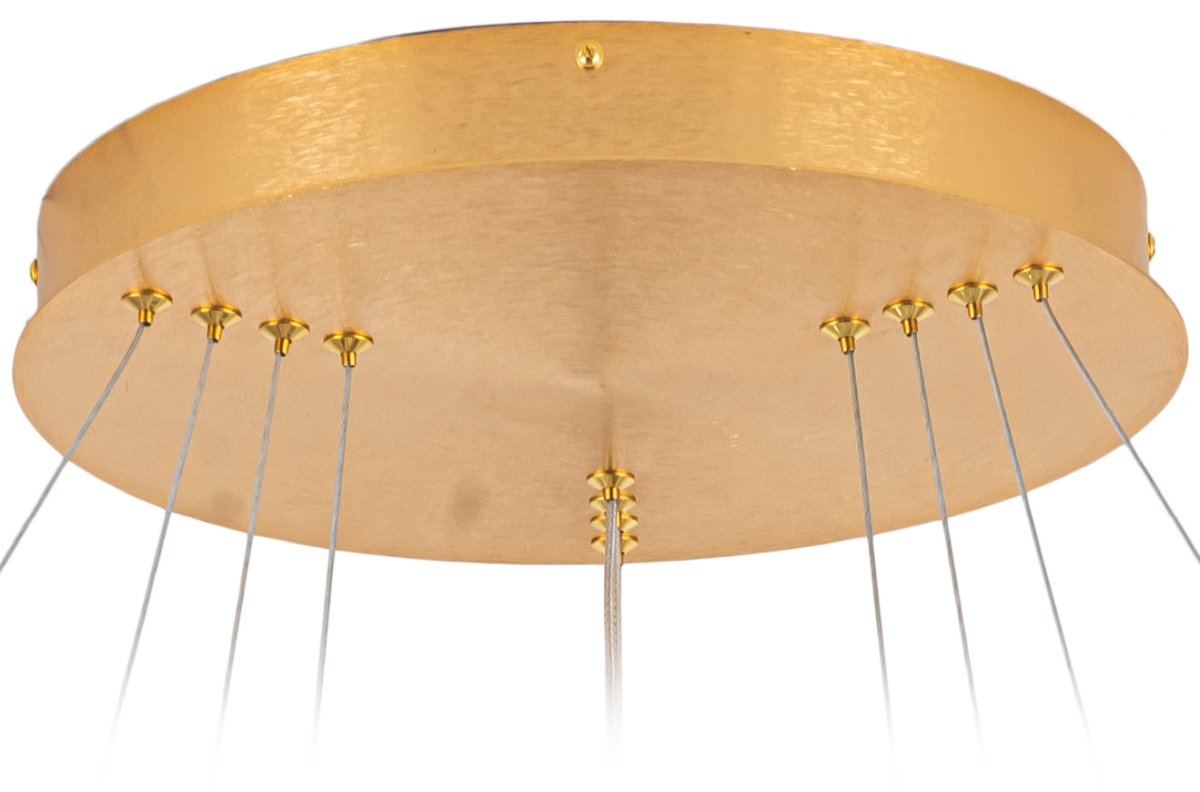 Люстра подвесная из коллекции Tooring / Туринг имеет арматуру из сплава алюминия, обработанную по технологии брашинг, и анодированную в цвет латуни. Светодиодные источники света закрыты белым матовым акрилом. Все модели коллекции Tooring / Туринг комплектуются пультом дистанционного управления 2,4G и драйвером высокого качества с европейским стандартом T?V. Пульт дистанционного управления обеспечивает переключение трех режимов световой температуры и диммирование.