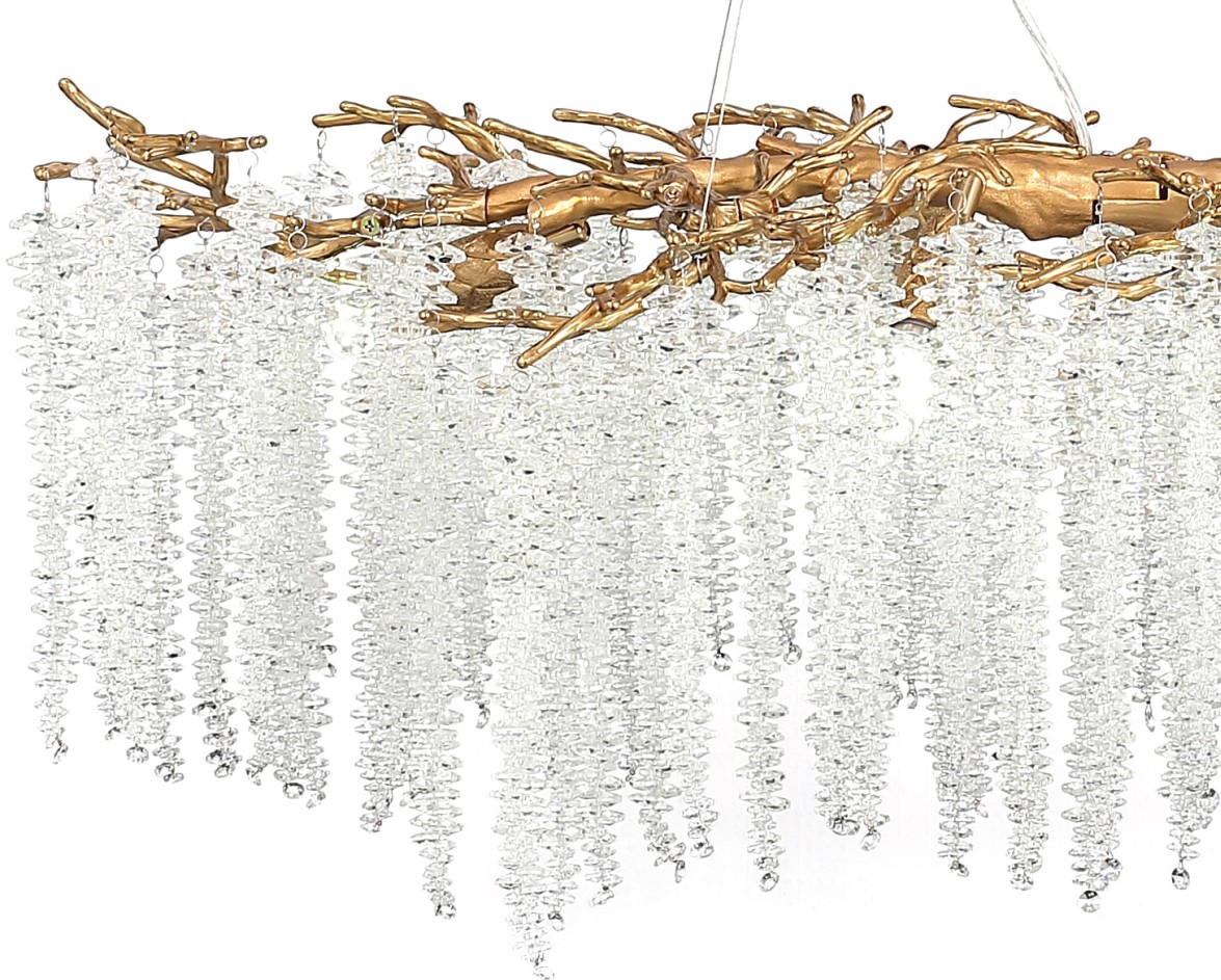Люстра подвесная вытянутой формы коллекции Eiva / Эйва выполнена из сплава алюминия, гальванизирована в цвет бронзы и декорирована гроздьями из хрусталя в форме октагон. Светильники отличает увеличенное количество хрусталя (120 хрустальных гроздьев), фактурная чеканка на потолочной чаше и лампы с цоколем Е14. Из данной коллекции светильников можно сделать индивидуальный заказ любого цвета и размера.