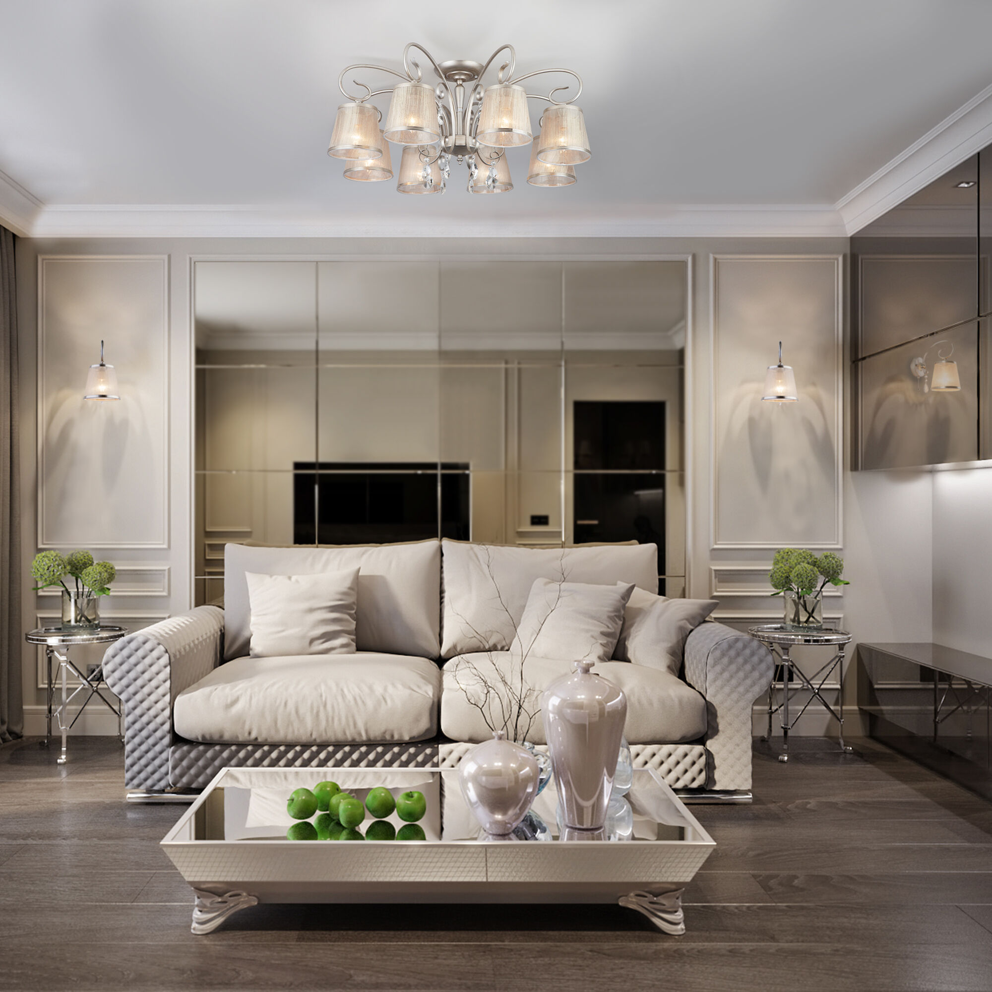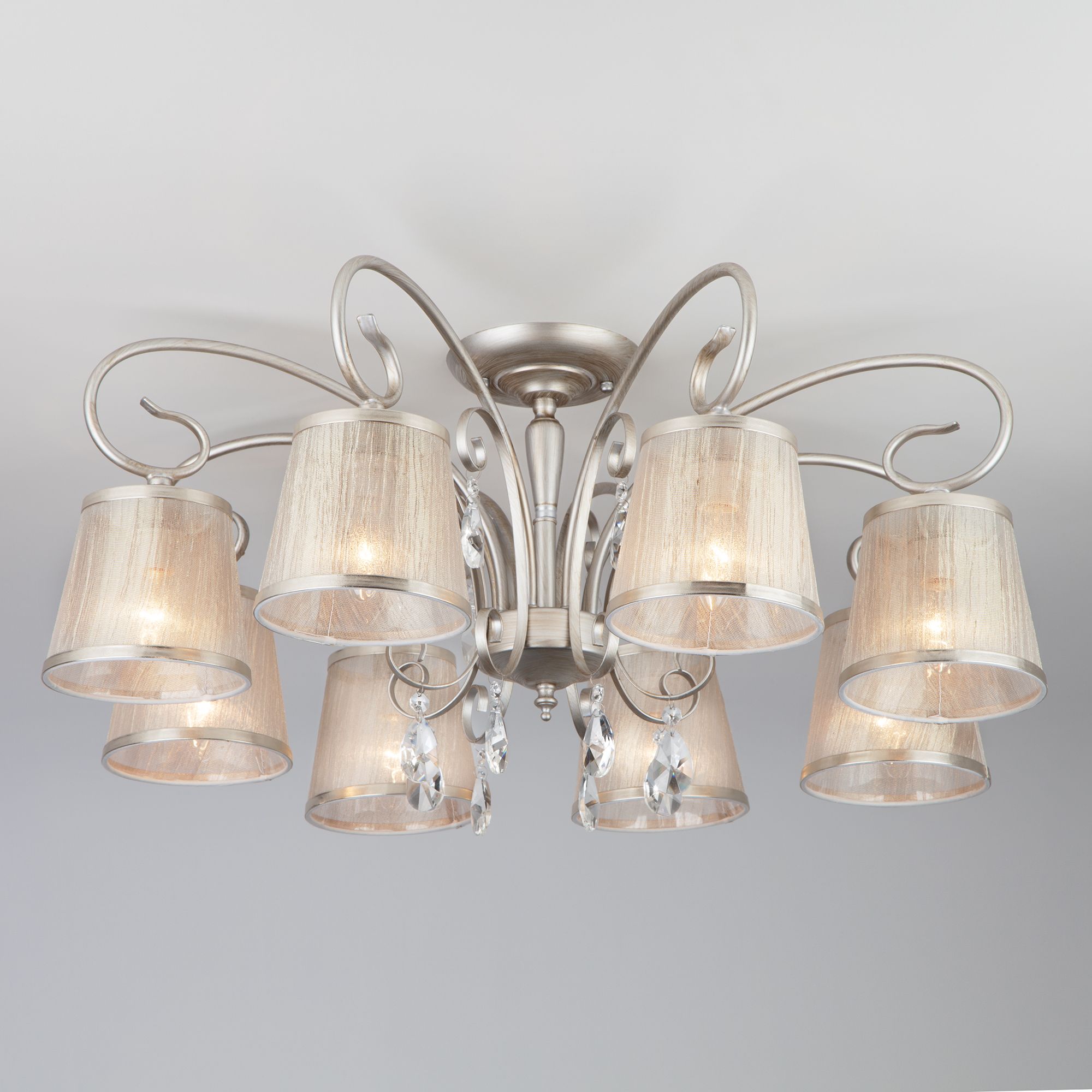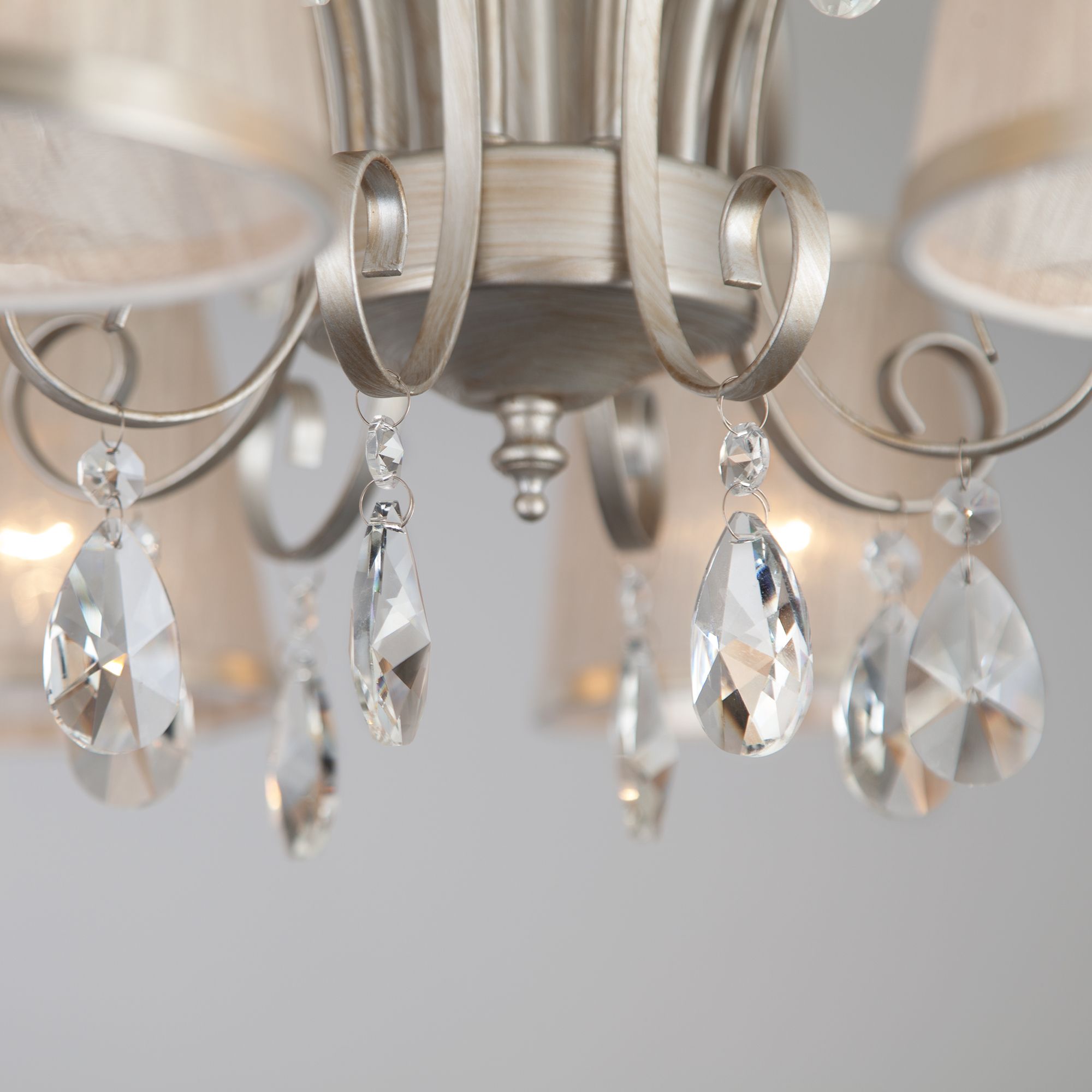 Утонченная серия светильников Liona идеально дополнит как классические, так и современные интерьеры. Великолепный образ сложился из сочетания воздушного основания в сдержанном цвете состаренного серебра, полупрозрачных абажуров и хрустальных подвесок.